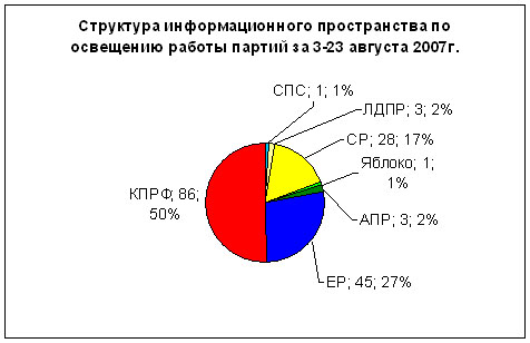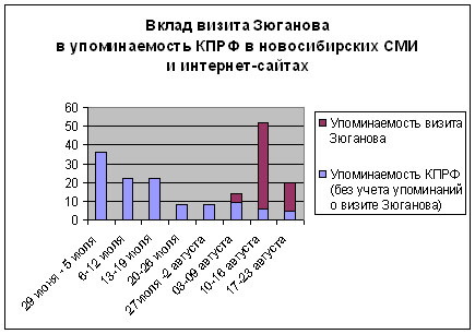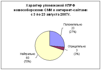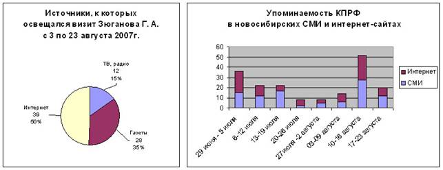Благодаря визиту Г. А. Зюганова за три недели с 3 по 23 августа 2007г. КПРФ удалось занять доминирующую позицию в политическом информационном пространстве. 86 публикаций и сюжетов из 167 (50%), освещающих работу политических партий в Новосибирской области, были посвящены КПРФ.