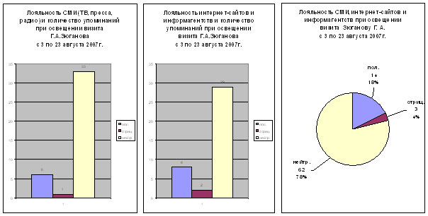 Причем из 86 публикаций о партии и визите Зюганова с 3 по 23 августа только 3 были отрицательных, а 83 (97%) были нейтральные или положительные. В целом, освещение СМИ, информагентствами и новостными сайтами визита носило нейтральный характер — 62 нейтральных упоминания (78%).