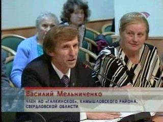 В. Мельниченко (член АО "Галкинское", Камышловского района, Свердловской области): Если кто-то думает, что если бы он своевременно, когда-то там оформил это в свою собственность и сегодня он был бы защищен всем не верьте. Наш кооператив все оформил. Мы были высокотехнологическим, многопрофильным таким предприятием, строили красивые дома и нас вот тем не менее со всеми нашими красными и синими, и голубыми свидетельствами пришли бандиты и забрали вместе с прокурором, вместе с главной района, вот и вместе с милицией.