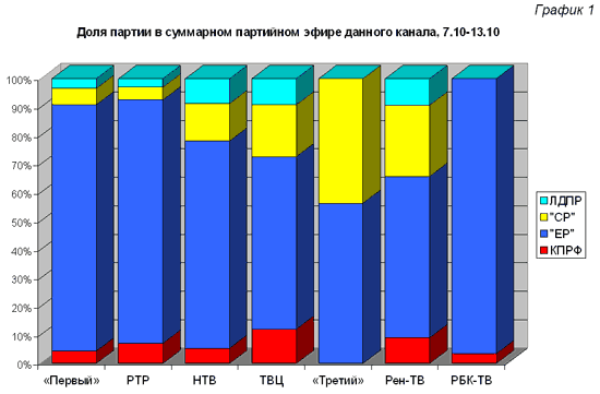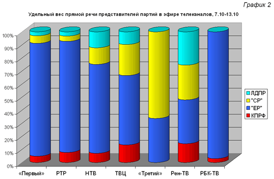 Монопольное положение «ЕР» в телеэфире особенно очевидно на РБК-ТВ, «Первом» канале и РТР. Здесь прямая речь представителей этой партии заняла, соответственно, 97, 86 и 85 процентов от суммарного синхрона представителей всех партий. Доля КПРФ в суммарной продолжительности прямой речи политиков на ТВ оказалась максимальна в шестую предвыборную неделю на телеканалах Рен-ТВ и ТВЦ (14 и 13%), а «Третий» канал в течение всей недели не предоставил слово коммунистам.