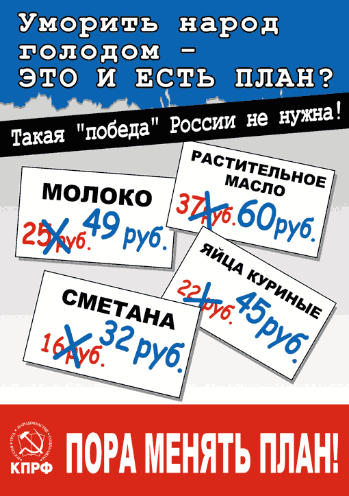Вот еще и одним шагам по реализации «Плана Путина» российская власть «порадовала» народ, допустив где полуторный, а где и двукратный рост цен уже не только на хлеб, но практически на весь спектр основных продуктов питания. «Пора менять План!»- призывает листовка, выпущенная коммунистами в Подмосковье.