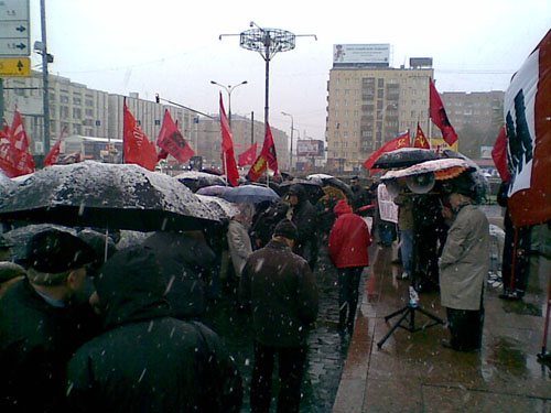 Выступавшие отмечали, что в России наблюдается рост рабочего движения. Самой значительной рабочей акцией за это время стала забастовка на АвтоВАЗе. Крупные выступления рабочих прошли на "Кургантехэнерго", "Михайловцементе", "Костомукшском окатыше". В то же время усиливаются и гонения на рабочих активистов со стороны собственников. Обращаясь к собравшимся, С.Биец (РРП) подчеркнул, что только солидарные действия смогут переломить ситуацию и помочь нашим товарищам. Солидарная поддержка требуется и рабочим коллективам Москвы. Рабочие старейшей фабрики России "Трехгорной мануфактуры" уже третью неделю живут в общежитии без света и отопления, им задерживают зарплату. Тяжелое положение и у рабочих Бабаевской фабрики: низкие зарплаты при фактически 12-часовом рабочем дне, постоянное урезание, а то и полная отмена премий и доплат за мастерство, угроза сокращений…. Все это будет продолжаться до тех пор, пока рабочие будут действовать разобщенно, неорганизованно. С.Удальцов (АКМ) отметил, что будущее страны в руках рабочего класса. Власть должна быть не у чинуш, которых проталкивает вверх "Единая Россия" и иже с ней. Будущими президентами должны стать такие люди, как рабочие активисты с АвтоВАЗа, Захаркин из "Профсвободы", Коган, Лопаревич из "Набата". Представитель Совета рабочих Москвы В.Шишкарев заострил внимание на том, что труд рабочего должен быть достойно оплачен. Питерские докеры подсчитали, что достойной может считаться зарплата 200 000 руб. в месяц. Именно такой ее уровень позволяет приобрести за 25 лет работы квартиру, поднять детей… И за такую зарплату докеры Питера будут бороться. Представитель КПРФ П.Лыткин обратил внимание собравшихся, что только отмена Трудового кодекса позволит рабочим реализовать свои конституционные права и, в частности, право на забастовку. Сейчас по закону от инициирования забастовки до ее воплощения в реальность должно пройти около 40 дней переговоров, согласований и утрясок.