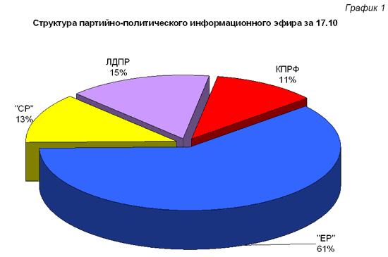 17 октября. Сорок шестой день выборной кампании на ТВ: Из 18 мин 56 сек. партийного телеэфира 61% досталось "ЕР", 15% - ЛДПР, 13% - "СР", а КПРФ - 11%