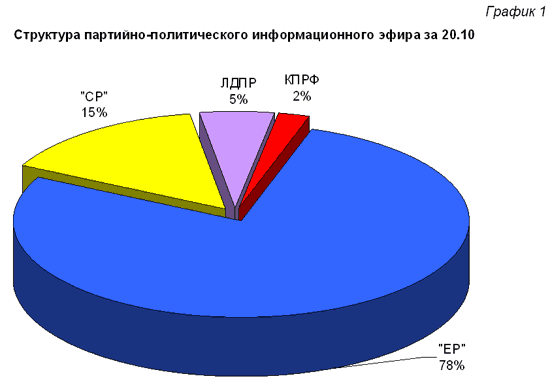 20 октября. Сорок девятый день выборной кампании на ТВ: Из 29 мин 2 сек. партийного телеэфира 77% досталось "ЕР", 15% - "СР", 5% - ЛДПР, а КПРФ - 2%
