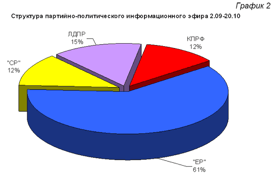 Монопольное положение заняла «ЕР» в телеэфире РТР и «Третьего» канала (100% партийного синхрона). Единственный телеканал, предоставивший слово коммунистам – Рен-ТВ (11%).