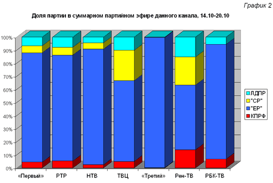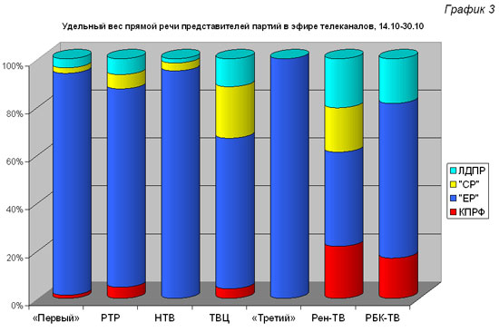 Монопольное положение «ЕР» в телеэфире особенно очевидно на «Третьем» канале, НТВ и «Первом». Здесь прямая речь представителей этой партии заняла, соответственно, 100, 95 и 93 процента от суммарного синхрона представителей всех партий. Доля КПРФ в суммарной продолжительности прямой речи политиков на ТВ оказалась максимальна в седьмую предвыборную неделю на телеканалах Рен-ТВ и РБК (22 и 17%), а НТВ и «Третий» канал в течение всей недели не предоставили слово коммунистам.