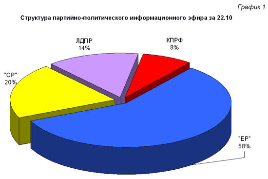 22 октября. Пятьдесят первый день выборной кампании на ТВ: Из 17 мин 33 сек. партийного телеэфира 58% досталось "ЕР", 20% - "СР", 14% - ЛДПР, а КПРФ - 8%