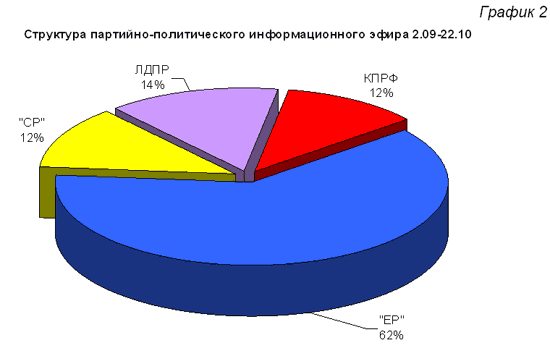 «Единая Россия». Режим наибольшего благоприятствования «ЕР» получила на РТР и «Первом» канале. Соответственно здесь эта партия имела 85 и 70% всего информационно-политического телеэфира.