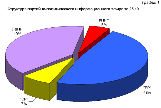 25 октября. Пятьдесят четвёртый день выборной кампании на ТВ: Из 30 мин 16 сек. партийного телеэфира 43% досталось "ЕР", 35% - ЛДПР, 7% - "СР", а КПРФ - 5%