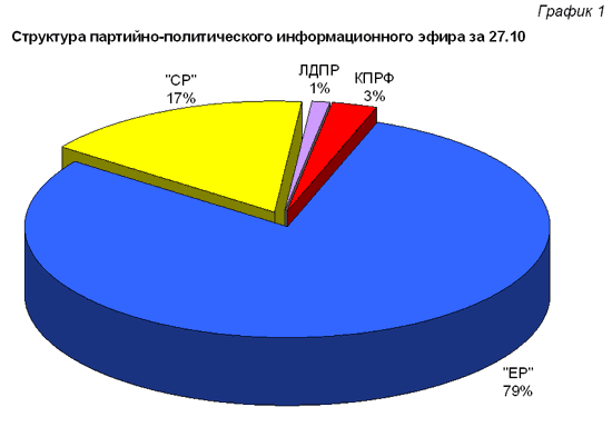 27 октября. Пятьдесят шестой день выборной кампании на ТВ: Из 31 мин 22 сек. партийного телеэфира 79% досталось "ЕР", 16% - "СР", 3% - КПРФ и 1% - ЛДПР