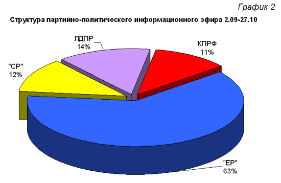 Монопольное положение «ЕР» в телеэфире особенно очевидно на «Третьем» канале и ТВЦ. Здесь прямая речь представителей этой партии заняла, соответственно, 100 и 98 процентов от суммарного синхрона представителей всех партий. Доля КПРФ в суммарной продолжительности прямой речи политиков на ТВ оказалась максимальна в субботу на «Первом» канале (50%). «Третий» канал и Рен-ТВ слово коммунистам не предоставили.