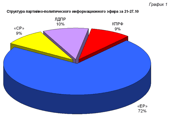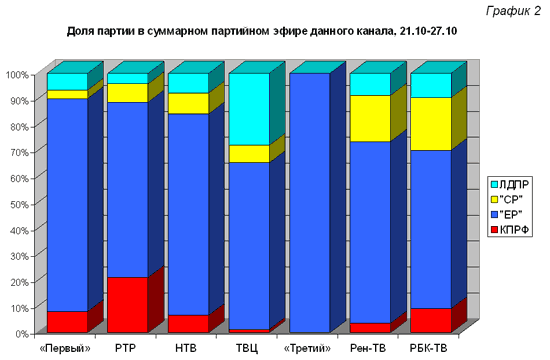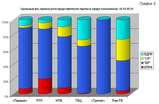 Монопольное положение «ЕР» в телеэфире особенно очевидно на «Третьем» и «Первом» каналах. Здесь прямая речь представителей этой партии заняла, соответственно, 100 и 82 процента от суммарного синхрона представителей всех партий. Доля КПРФ в суммарной продолжительности прямой речи политиков на ТВ оказалась максимальна в предвыборную неделю на телеканалах РТР и НТВ (20 и 8%), а «Третий» канал в течение всей недели не предоставил слово коммунистам.
