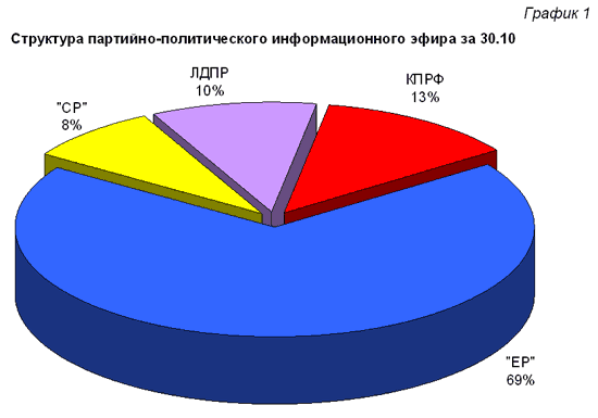 30 октября. Пятьдесят девятый день выборной кампании на ТВ: Из 12 мин 56 сек. партийного телеэфира 69% досталось "ЕР", 13% - КПРФ, 10% - ЛДПР и 8% - "СР"