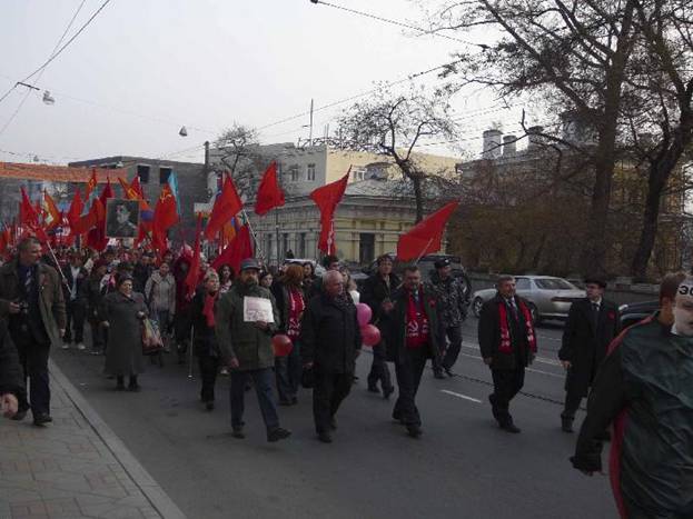 На этот раз, на удивление многим СМИ - представителей радио- и телекомпаний, к скверу стала стекаться студенческая молодежь. Молодые люди по одиночки и группами собирались в скверике, с красными знаменами, транспарантами, с плакатами, многие в красных накидках с эмблемой КПРФ, о чем то весело говорили, поздравляли друг друга и прохожих с праздником - Днем Октябрьской революции. Играли марши и песни Советской поры, песни красного сопротивления. Дружно и громко скандировали лозунги. Особенно часто выкрикивали лозунг: "Студентам - бесплатное образование!". Его тут же с удовольствием подхватывали все демонстранты. Тут же корреспонденты брали интервью, многие прохожие снимали сбор демонстрантов на сотовые телефоны или домашние телекамеры. Особое внимание привлекли ряженые. Это трое молодых комсомольцев, членов СКМ, в карнавальных костюмах и масках, символизирующих Змея Горыныча и три его головы - политические партии и политиков - Путина (Едро), Жириновского (ЛДПР), Миронова (ЕСЕР). Не смотря на протесты милиции, демонстрантам удалось отстоять право молодежи на свое видение сути политических партий и их представителей, пусть и в таком символическом и карикатурном виде. Так этот трехглавый Змей Горыныч и прошел по главной улице в рядах демонстрантов через весь город до центральной площади.
