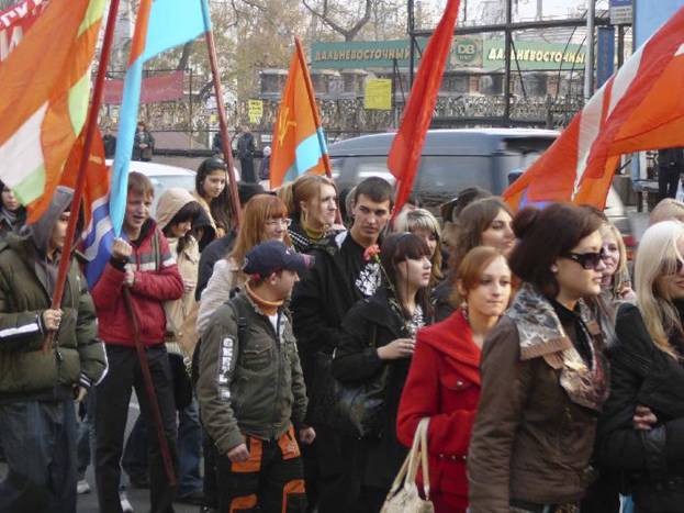 По сложившейся традиции с 15-00 начался сбор участников демонстрации в сквере у Дальзавода. И хотя самого Дальзавода фактически нет, на его месте образовано множество различного рода самостоятельных торговых, посреднических и обслуживающих предприятий, фирм, разного рода ОАО и проч., жителям города дорого это место как память о временах Советской власти, когда Владивосток был центром промышленности края, ядром промышленного пролетариата.