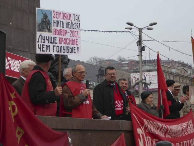 Возглавили колонну демонстрантов Первый секретарь Комитета Приморского краевого отделения КПРФ В.В.Гришуков и Первый секретарь ЦК РКРП В.А.Тюлькин, оба депутаты ГД ФС РФ, оба кандидаты в депутаты от списка КПРФ по Приморскому краю.