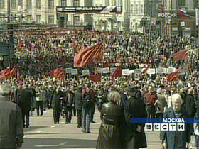 ШПИЛЕВА: Центр Москвы на время стал красного цвета. Потоки людей с флагами, знаменами, транспарантами маршировали по Тверской и Моховой улицам. Демонстрантов было так много, что шествие сильно растянулось по проезжей части, а на тротуарах собралось довольно много зевак.