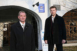 На фото Н.Гернета: член ЦК КПРФ Андрей Андреев (справа) и руководитель регионального отделения КПРФ Александр Новиков на фоне здания подворья Соловецкого монастыря, в котором располагается штаб единороссов.