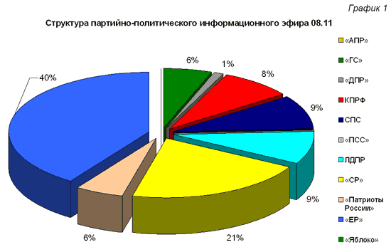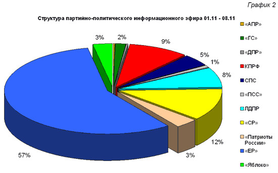 Из них 40% было отведено «Единой России», 21% - «Справедливой России», по 9% - СПС и ЛДПР, по 6% - «Гражданской силе» и «Патриотам России» и 1% - «Демократической партии России». Компартии досталось 8% эфира, или 2 мин 42 сек, что в 5 раз меньше, чем «ЕР», в 2,5 раза меньше, чем «СР». Таким образом, крупнейшей оппозиционной партии, представленной в Госдуме, федеральные телеканалы предоставили не только меньше эфира, чем всем другим парламентским партиям, но и даже меньше, чем непарламентской СПС. Компартия заняла пятое место по доле эфирного времени среди партий-претендентов на думские места.