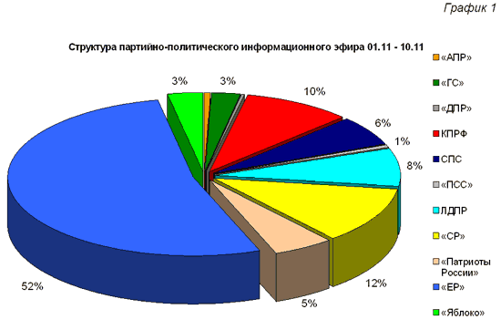 Из них 52% было отведено «Единой России», 12% - «Справедливой России», 8% - ЛДПР, 6% - СПС, 5% - «Патриотам России», по 3% - «Яблоку» и «Гражданской силе», по 0,53% - Партии социальной справедливости, 0,47% - Аграрной партии и 0,2% - Демократической партии России. Компартии досталось 10% эфира, или 22 мин 18 сек, что в 5,6 раз меньше, чем «Единой России» и в 1,2 раза меньше, чем «СР».