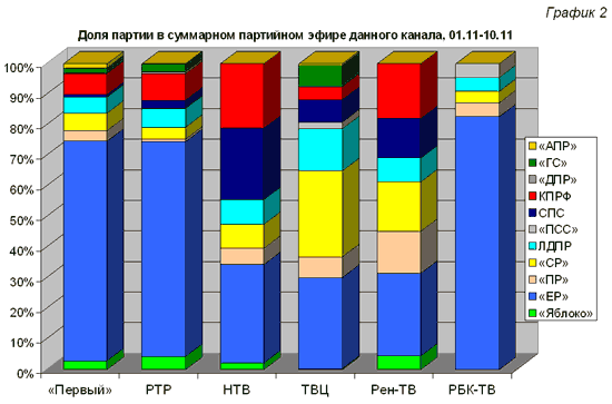 Максимальную долю эфирного времени получила СПС на НТВ (23%), «Патриоты России» и «Яблоко» - на Рен-ТВ (14 и 5%), «Гражданская сила» - на ТВЦ (7%), Партия социальной справедливости – на РБК-ТВ (5%), Аграрная партия – на «Первом» канале (1,3%) и Демократическая партия России – на РТР (0,7%).