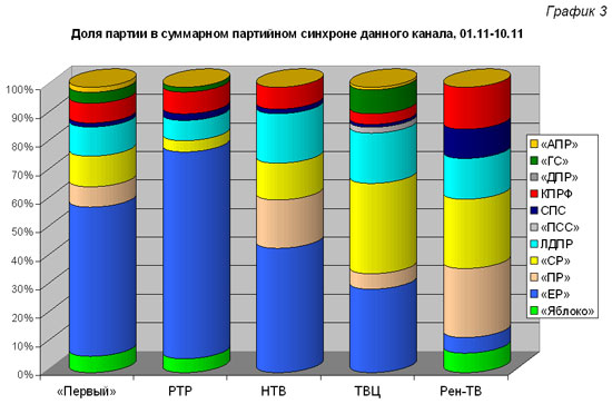 Максимальную долю суммарного партийного синхрона получили коммунисты на Рен-ТВ, НТВ и РТР (15 и по 8%), единороссы – на РТР и «Первом» канале (73 и 52%), справороссы – на ТВЦ и Рен-ТВ (32 и 24%), представители ЛДПР – на ТВЦ и НТВ (18 и 17%). Больше всего прямой речи «Патриотов России» и «Яблоко» пришлось на Рен-ТВ (24 и 7%), «Гражданской силы» - на ТВЦ (8%), СПС – на Рен-ТВ (10%), аграриев – на «Первом» и «ПСС» - на ТВЦ (по 2%) .