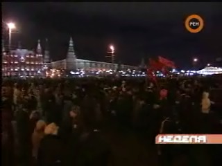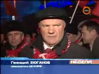 REN TV # Неделя, «Предвыборная компания вышла на финишную прямую» | Хотя на неделе недалеко от Кремлевских стен Путина все же ругали. Это коммунисты отмечали 7 ноября круглую дату - 90 лет со дня Октябрьской революции. Лучшего повода громко заявить о себе за три недели до выборов и не придумать. В середине рабочей недели в самый час-пик, перекрыв автомобильное движение, по центральным улицам столицы прошли около 6 тыс. оппозиционеров с красными флагами. Демонстрируя мирную мощь своих соратников, лидер КПРФ вспоминал о революции 17-го года. |