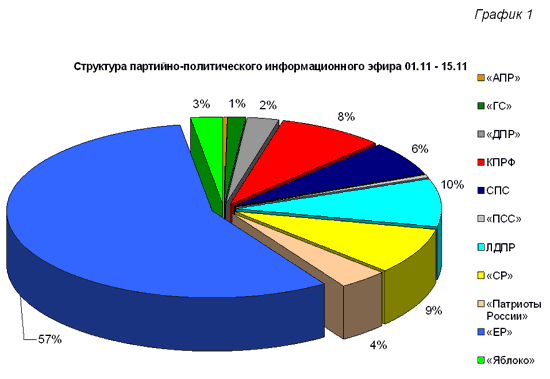 С 1 ноября, когда стал ясен состав участников предвыборной гонки, Центр исследований политической культуры России ведёт анализ представленности в информационных выпусках ТВ не только четырёх думских партий (КПРФ, «Единой России», ЛДПР и «Справедливой России»), но и всех остальных партий-участниц выборной кампании. Сразу заметим, что расширение объектов мониторинга не изменило общей картины тотального доминирования в информационном пространстве партии власти – «Единой России». Если с момента старта предвыборной кампании 2 сентября до 31 октября доля информационного телеэфира, занятого «Единой Россией» в общем объеме представленности четырёх думских партий составила 61,1 процента (ЛДПР – 15,1, «СР» - 12,2, КПРФ – 11,6), то мониторинг по 11 партиям за 1-15 ноября выявил долю «ЕР» в 57 процентов. Как видим,: даже с учетом телевизионной активности не только четырех думских партий, но и ещё семи других участников выборной кампании «Единая Россия» всё-равно занимает почти три пятых объема информационного-политического телепространства.