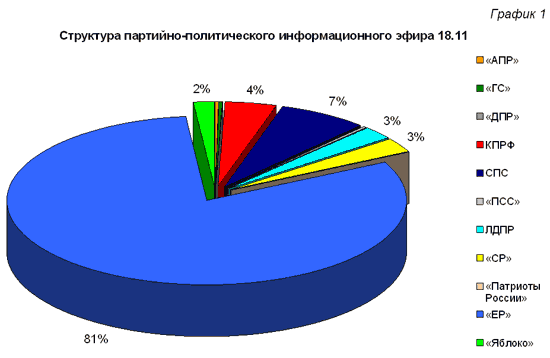 Из них 81% было отведено «Единой России», 7% - СПС, 3% - «Справедливой России», по 2% - ЛДПР и «Яблоку», 0,3% - «Гражданской Силе», 0,2% - АПР, по 0,1% - ПСС, ДПР и «Патриотам России». Компартии досталось 4% эфира, или 3 мин 18 сек, что в 20 раз меньше, чем «Единой России» и в 1,8 раз меньше, чем СПС.