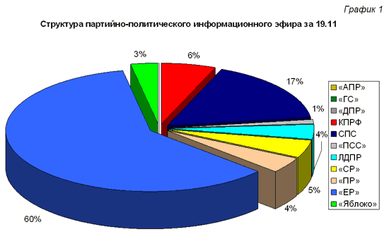 19 ноября. Семьдесят девятый день выборной кампании на ТВ: Из 48 мин 13 сек. партийного телеэфира 60% досталось "ЕР", 17% - СПС, а КПРФ - 6%