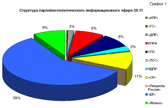 20 ноября. Восьмидесятый день выборной кампании на ТВ: Из 28 мин 23 сек. партийного телеэфира 59% досталось "ЕР", 11% - "СР", 9% - "Яблоку", 8% - СПС, а КПРФ - 7,7%
