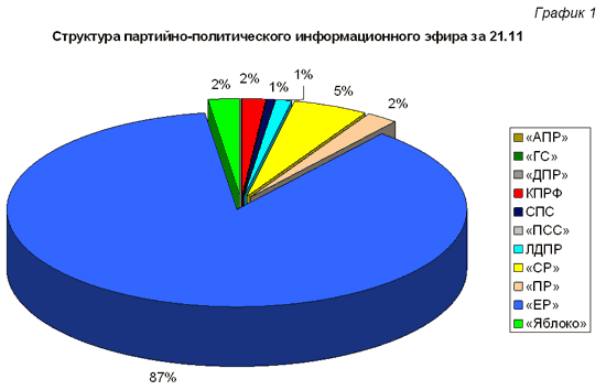 21 ноября. Восемьдесят первый день выборной кампании на ТВ: Из 1 ч 51 мин 59 сек. партийного телеэфира 87% досталось "ЕР", 5% - "СР", по 2% - "Яблоку" и "Патриотам России", а КПРФ - 1,6%