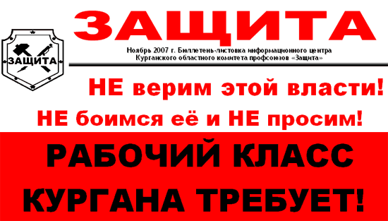 Курганский профсоюз «Защита» начал 22 ноября недельную акцию протеста против бесправия и издевательств над рабочими на промышленных предприятиях. На улицы вышли рабочие пикеты, распространялись листовки, в которых объяснялись действия рабочих и излагались их требования.