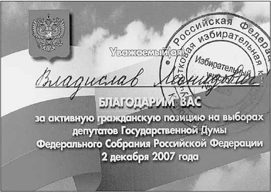 А ретивых в городе очень много. Например, работники большинства образовательных учреждений ни за что не согласились отдать памятные календарики в качестве сувенира своим чадам. Они берегли их, чтобы предъявить директорам школ, лицеев и прочих современных рассадников "доброго, умного, вечного". В таком же положении оказались и студенты. Я наблюдал, как на избирательном участке они бережно засовывали - волшебные календарики - в "потайные" кармашки. В недоуничтоженных индустриальных точках административные ретивцы порой вели себя еще круче. Выручала оборотная сторона "отчётного документа", где был набран такой текст: "Уважаемый (ая) - далее следует свободная строка - благодарим Вас за активную гражданскую позицию на выборах депутатов Государственной думы Федерального собрания Российской Федерации 2 декабря 2007 года". Если избиратель знал, что его начальник не только ретив, но и недоверчив, то голосующему на подмогу тут же приходили члены избиркома и вписывали в свободную строчку его имяотчество.