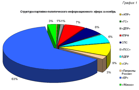 С 1 ноября Центр исследований политической культуры России ведёт анализ представленности в информационных выпусках ТВ не только четырёх думских партий, но и всех остальных партий-участниц выборной кампании. Расширение объектов мониторинга не изменило общей картины тотального доминирования в информационном пространстве «Единой России». Если с момента старта предвыборной кампании 2 сентября до 31 октября доля информационного телеэфира, занятого «Единой Россией» в общем объеме представленности четырёх думских партий составила 61,1 процента (ЛДПР – 15,1, «СР» - 12,2, КПРФ – 11,6), то мониторинг по 11 партиям за ноябрь выявил долю «ЕР» в 63,2 процента. Даже с учетом телевизионной активности не только четырех думских партий, но и ещё семи других участников выборной кампании, доля «Единой России» не уменьшилась: эта партия занимает почти две трети объёма информационного-политического телепространства.