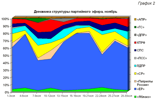 Структура партийного эфира на протяжении месяца не оставалась неизменной. На Графике 2 представлена динамика по трёхдневным отрезкам: