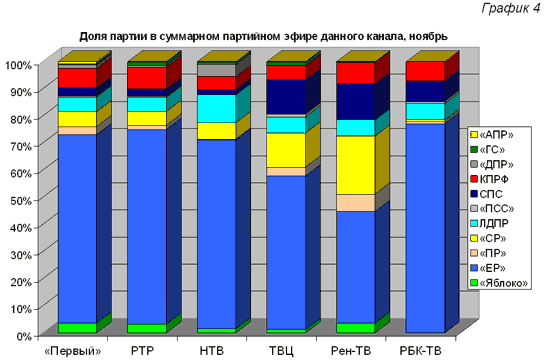 КПРФ. Максимальную долю эфирного времени КПРФ получила в ноябре на РТР и Рен-ТВ (по 8%). Минимальную – на НТВ и ТВЦ (по 5%).