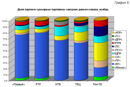 Максимальную долю суммарного партийного синхрона получили коммунисты на Рен-ТВ и РТР (10 и 7%), единороссы – на РТР и «Первом» канале (76 и 73%), справороссы – на Рен-ТВ и ТВЦ (30 и 15%), представители ЛДПР – на НТВ и Рен-ТВ (16 и 11%). Больше всего прямой речи представителей СПС, «Патриотов России» и «Яблоко» пришлось на Рен-ТВ (16, 11 и 6%), ДПР и «Гражданской силы» – на НТВ (6 и 2%), «ПСС» - на ТВЦ (1,2%), аграриев – на «Первом» (0,4%).