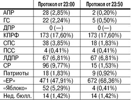 Все они поставили свои подписи под фальшивкой или, в лучшем случае, под чистым листом, заготовленным для фальшивки. А теперь сравните результаты выборов до и после переписывания протокола: А теперь по порядку. День выборов с 7:45 утра до 21:30 мне посчастливилось провести на 301-м избирательном участке, куда я напросился членом УИК с совещательным голосом от КПРФ (других партий, заинтересованных в моих услугах, я в городе не нашёл). Впечатления были в целом позитивные, никаких сомнений в честности подсчёта у меня нет. Ночью я уломал председателя и секретаря комиссии разрешить мне сопровождать их с протоколами в ТИК, да так там до утра и остался: помогло удостоверение журналиста, хотя часа полтора пришлось провести в ожидании аккредитации. В территориальной избирательной комиссии города Долгопрудного, куда председатели УИКов ночью приносили протоколы, их встречали члены ТИК с совещательным голосом от "Справедливой России" Михаил Фальченко, от "Яблока" — Геннадий Проничев и член ТИК с решающим голосом Николай Рябов (первый секретарь горкома КПРФ).