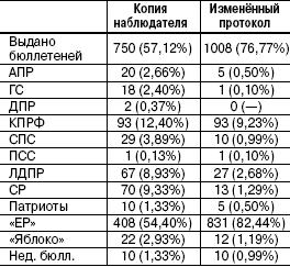 Протокол отличался от наблюдательской копии на одну цифру — 350, но в пяти строках. Вот как это изменение сказалось на результатах выборов по участку: Коммунистам удалось дозвониться до своей представительницы в этом УИКе Татьяны Васильевой, которая подтвердила, что подписывала протокол с пятьюстами с лишним погашенными бюллетенями, а не с двумястами. В качестве способа разрешения парадокса территориальная комиссия приняла решение о пересчёте бюллетеней на месте. Пересчёт показал, что в пачке погашенных бюллетеней их действительно 217, а в пачке за "ЕР" — 1325. Хочется надеяться, что Татьяна Алексеевна не махнёт рукой на это дело и разберётся, кто поставил подпись под протоколом с цифрой 217, а кто — с цифрой 567.