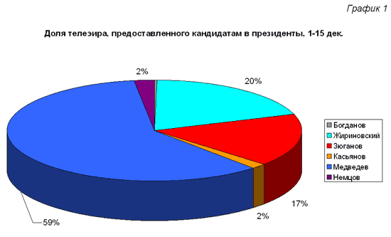 Впрочем, до выдвижения Медведева в «преемники» структура телеэфира впервые за многие месяцы практически полностью определялась действительно наличием информационных поводов. Так, выдвинувшиеся в президенты Немцов и Касьянов получили 8 декабря свои 22 и 41 процент эфира соответственно. О Медведеве в этот день было всего 9 секунд информации. Увеличилась в эти дни и доля эфира, предоставленного Г.А.Зюганову. Однако увеличилась не абсолютная, а относительная величина телевизионной представленности: не столько за счёт повышения продолжительности освещения его деятельности, сколько в основном за счёт «затишья» в пиаре Медведева, о котором три дня до его выдвижения почти ничего не говорилось.