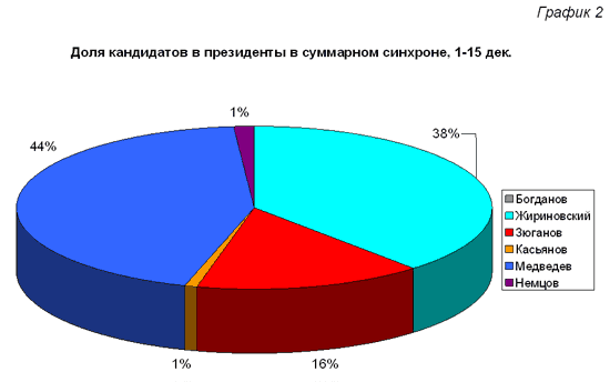 Таким образом, мы имеем в первой половине декабря три «волны» оккупации эфира преемником: «день тишины» перед выборами со скрытой и не очень рекламой «Единой России»; посещение еврейской общины Медведевым на фоне почти полного отсутствия информации о других политических лидерах; выдвижение Медведева в «преемники». Три волны экспансии В.В.Жириновского: прохождение ЛДПР в Думу; участие Жириноского в передаче «Народ хочет знать» (дало значительную продолжительность синхрона); съезд ЛДПР. Три волны прорыва Г.А.Зюганова в телеинформпространство: второе место в парламенте; решение Г.А.Зюганова участвовать в президентской гонке (35% эфира 9 декрабря); съезд КПРФ.