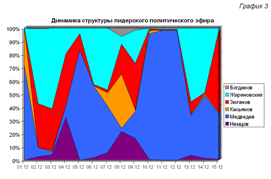 В первые послевыборные три дня Г.А.Зюганов и В.В.Жириновский привлекали внимание СМИ как лидеры партий, вошедших в Госдуму. Поэтому их доля в лидерском политэфире была велика (до 61% для В.В.Жириновского и до 39% для Г.А.Зюганова). Всего через пару дней тема парламентских выборов начала себя исчерпывать, в результате чего резко увеличилась представленность на телеэкранах тогда ещё потенциального преемника: пятого декабря весь день говорили о посещении Медведевым еврейской общины (83% эфира).