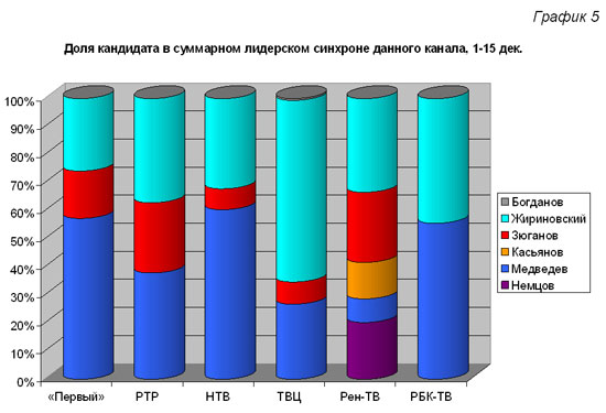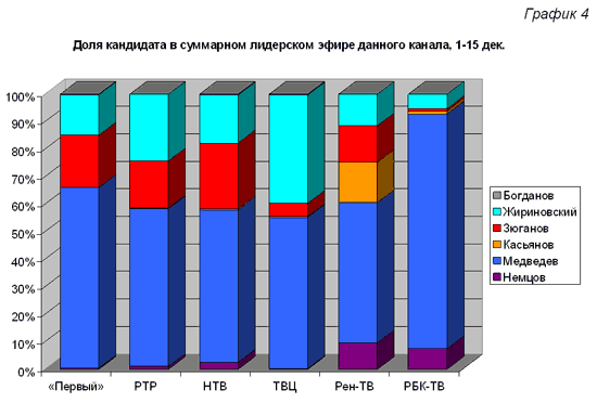 Максимальную долю суммарного партийного синхрона получил Г.А.Зюганов на Рен-ТВ и РТР (по 25%). Телеканал РБК слово Председателю ЦК КПРФ не предоставил. Д.А.Медведев преобладал в наибольшей степени на НТВ и «Первом» канале (60 и 57%). В.В.Жириновский – на ТВЦ и РБК (65 и 44%), Единственным телеканалом, предоставившим слово Б.Е.Немцову и М.М.Касьянову, оказался Рен-ТВ (27 и 8% соответственно).