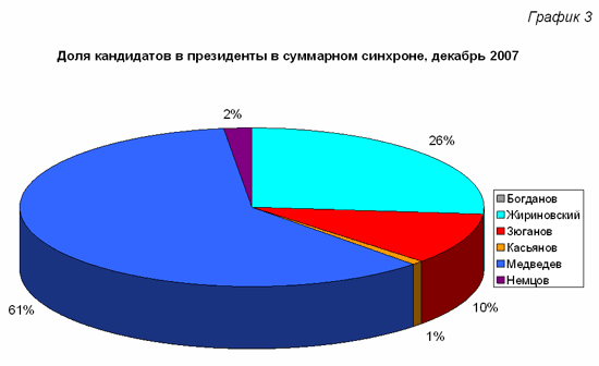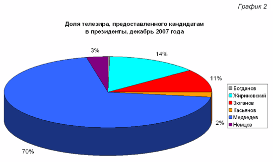 За декабрь 2007 года на общефедеральных телеканалах в выпусках новостей и информационно-аналитических программах вышло всего 1339 сообщений с упоминанием о шести кандидатах в президенты, то есть в среднем 43 сообщения в день. Это в 1,7 раз больше, чем сообщений с упоминанием хотя бы одной из 11 партий, участвовавших в думской избирательной кампании, в период самой активной агитации – в ноябре месяце. Тот факт, что федеральные телеканалы за два месяца до дня голосования уделяли в 1,5-2 раза больше внимания политике (и кандидатам в президенты в частности) чем партиям – непосредственно перед парламентскими выборами, говорит о большей значимости президентских выборов по сравнению с парламентскими – для тех, кто принимает решения по контенту телеэфира. Вероятно, присутствует неуверенность в «сокрушительности» победы кандидата от партии власти, а «параметры» его победы на президентских выборах играют для правящей группировки весьма существенную роль.