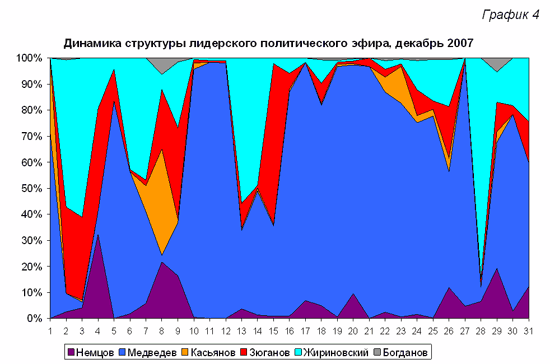 Наглядно видна асимметрия в распределении эфира в первую и вторую половину месяца. Если в начале декабря присутствовали некоторые флуктуации, волны в представленности кандидатов на телеэкранах, то начиная с 16 декабря (кроме одного дня – 28.12) доминирующее положение Медведева – абсолютно. Очевидно, что появившаяся (окончательная, организационно закреплённая) определённость с личностью преемника мгновенно задала принципы в распределении эфирного времени, в котором до этого дня допускались какие-то «вольности».