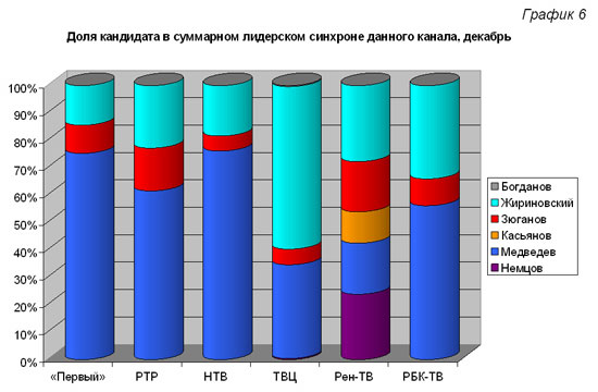 Максимальную долю суммарного партийного синхрона получил Г.А.Зюганов на Рен-ТВ и РТР (18 и 16%). Д.А.Медведев оккупировал эфир прежде всего НТВ и «Первого» канала (76 и 75%). В.В.Жириновский доминировал на ТВЦ и РБК (59 и 34%). Единственным телеканалом, предоставившим слово Б.Е.Немцову и М.М.Касьянову, оказался Рен-ТВ (24 и 11% соответственно).