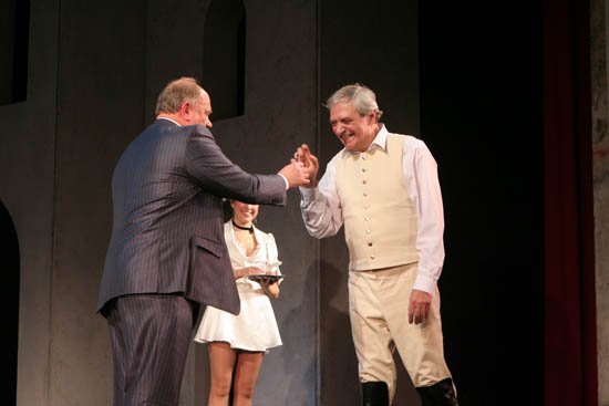 Г.А. Зюганов принял участие в Юбилейном вечере народного артиста России Александра Сергеевича Лазарева, состоявшемся 15 января в Московском академическом театре им. Вл. Маяковского. Москва чествовала своего любимого актера. Зал то взрывался овациями, то, затаив дыхание, следил за игрой выдающегося Мастера. Александр Сергеевич подарил зрителям встречу с лучшими своими героями, блистательно сыгранными в разные годы его творческой деятельности: Городничий, Федор Павлович Карамазов, Дон Кихот, Кин. В ответ кроме аплодисментов звучали, конечно, и поздравления. Одному из первых слово было предоставлено руководителю фракции КПРФ В Государственной Думе РФ Г.А. Зюганову. Надо отметить, что и выступление Геннадия Андреевича прерывалось аплодисментами. Четко уловив настроение присутствующих, зная многих из деятелей культуры лично, он нашел именно те слова и интонации, которые пришлись по душе и юбиляру, и публике.