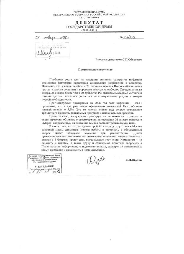 Депутат Госдумы от фракции КПРФ С.П.Обухов внёс на пленарном заседании Госдумы 25 января проект запроса Правительству по проблеме роста цен на продукты питания и раскрутке инфляции. Думские «Медведи» отказались поддержать это протокольное поручение к правительству.