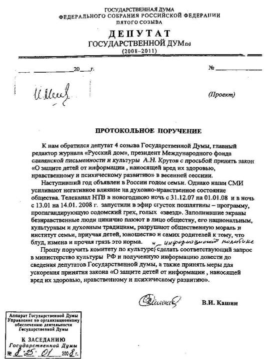 К нам обратился депутат 4 созыва Государственной Думы, главный редактор журнала «Русский дом», президент Международного фонда славянской письменности и культуры А.Н. Крутое с просьбой принять закон «О защите детей от информации, наносящей вред их здоровью, нравственному и психическому развитию» в весенней сессиии.